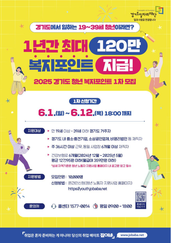 경기도 거주 청년 근로자를 위한 ‘청년 복지포인트’ 2025년 2차 모집이 마침내 시작되었습니다. 연간 최대 120만 원 상당의 포인트를 제공하며, 도서·문화·헬스·자기계발 등 다양한 서비스에 사용할 수 있어 실질적인 삶의 질 향상에 큰 도움이 됩니다. 8월 1일(목)부터 8월 12일(화)까지 진행되는 선착순 13,000명 모집이니, 자격 조건에 해당 된다면 지금 바로 신청하는 것이 좋습니다. 기회는 매년 한 번뿐이며, 평소 자기계발이나 여가 생활에 투자하고 싶었던 청년들에게는 놓칠 수 없는 지원입니다.