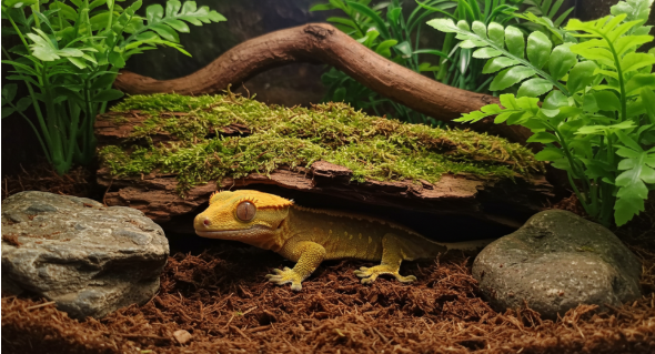 사육장 안에 1~2개 이상의 은신처를 마련해 도마뱀이 불안할 때 숨을 수 있게 해주세요. 코르크판, 반구형 은신용 바위, 작은 박스 등도 좋습니다.