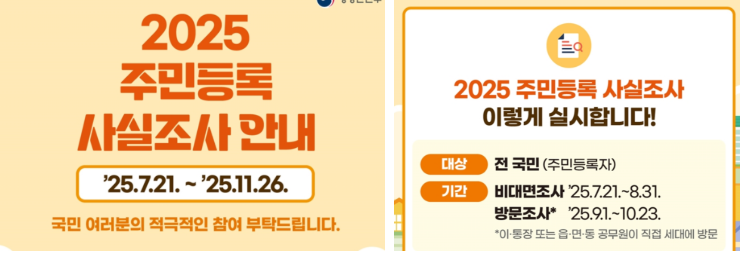 2025년 주민등록 사실조사는 7월 21일(월)부터 9월 25일(목)까지 약 2개월간 전국에서 일제히 실시됩니다.