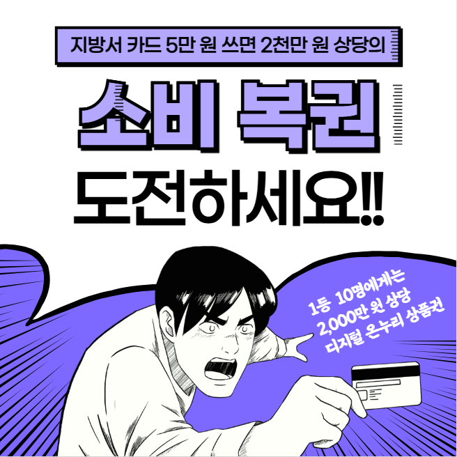 지방에서 5만 원만 카드 결제해도 응모권이 주어지는 소비 복권 이벤트는, 최대 2,000만 원의 온누리상품권 당첨 기회뿐 아니라 다양한 문화·관광 혜택을 함께 제공하는 '지방 소비 붐업'의 중심입니다. 올가을, 스마트한 소비로 당첨과 혜택을 동시에 챙겨보세요!