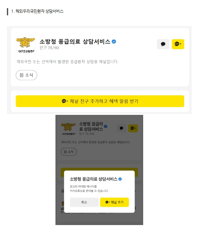 - 카카오톡 앱 실행 → 검색창에 ‘소방청 응급의료상담서비스’ 입력