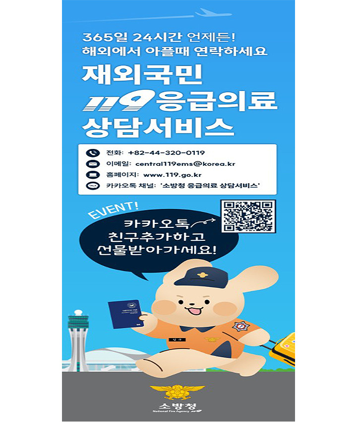 오는 7월 25일(금) 오후 2시, 인천국제공항 제1터미널 교통센터에서 ‘재외국민 119응급의료상담서비스’에 대한 현장 홍보 행사가 진행됩니다.