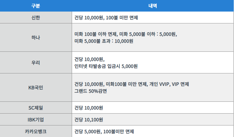 우리은행 | 3,000원 면제(3천불 이하) | 액수별 2,500원~? 전신료 8,000원(초과시) |