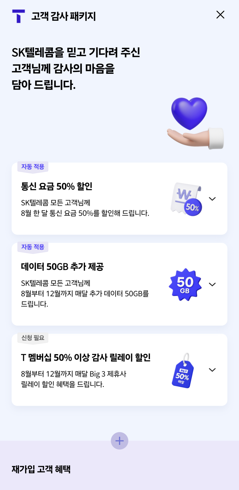 그래서 SKT가 위약금 면제, 8월 요금 50% 할인, 연말까지 매달 50GB 추가 데이터까지 보상안을 발표한 거랍니다.