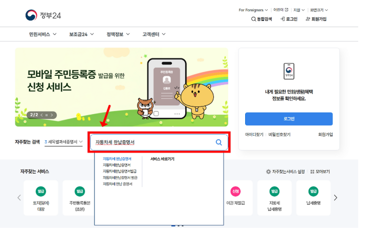 - 정부24 앱 → “자동차세 완납증명서” 검색 → 발급