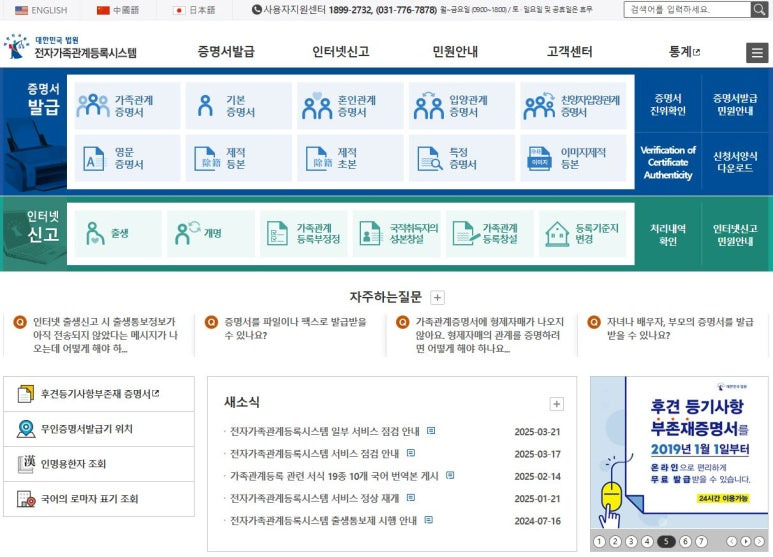 단순 발급뿐 아니라 출생, 혼인, 개명, 이혼, 입양, 등록기준지 변경 등 신고 업무도 인터넷으로 가능합니다.
