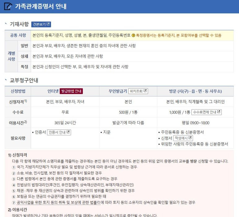 - 증명서 종류 선택: 가족관계, 기본, 혼인, 입양, 제적 등