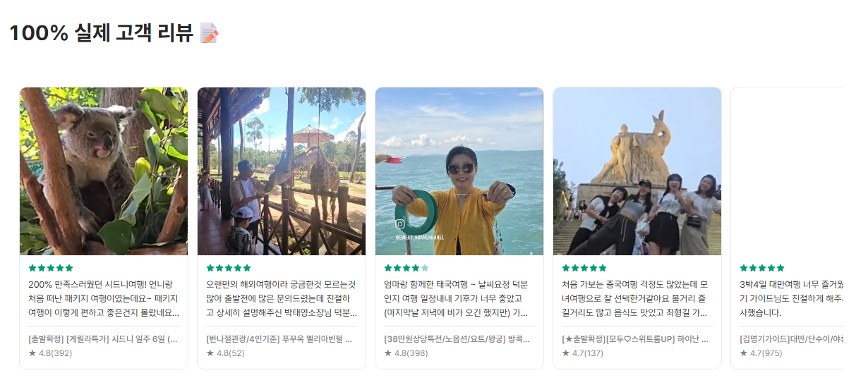 저렴한 가격 대비 알찬 일정과 친절한 가이드로 만족도가 꾸준히 상승 중입니다. 특히 1인 예약, 소규모 여행 상품군에서 좋은 반응을 얻고 있습니다.
