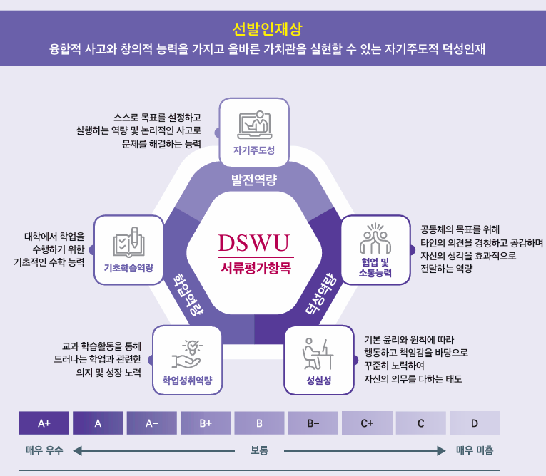- 학생부종합 인재상: 협동성, 도전정신, 리더십 중심
