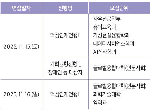 - 면접은 전공 및 전형에 따라 서류 100% 또는 서류+면접 반영 방식