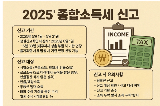 2025년 5월은 종합소득세 신고의 달입니다. 홈택스를 통한 전자신고부터 간편 신고 방법, 유의해야 할 핵심 사항까지 지금 꼭 알아야 할 정보를 정리했습니다. 복잡하게만 느껴졌던 종합소득세 신고, 이 글을 통해 쉽게 마스터해 보세요.